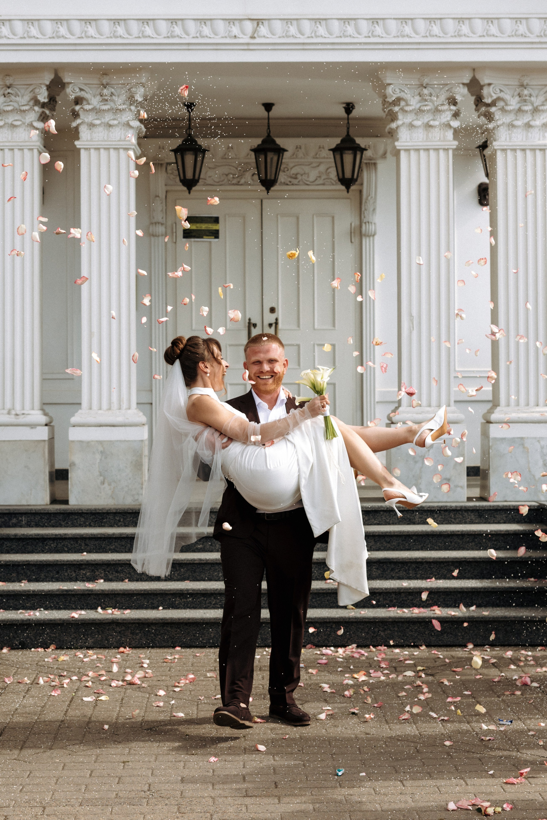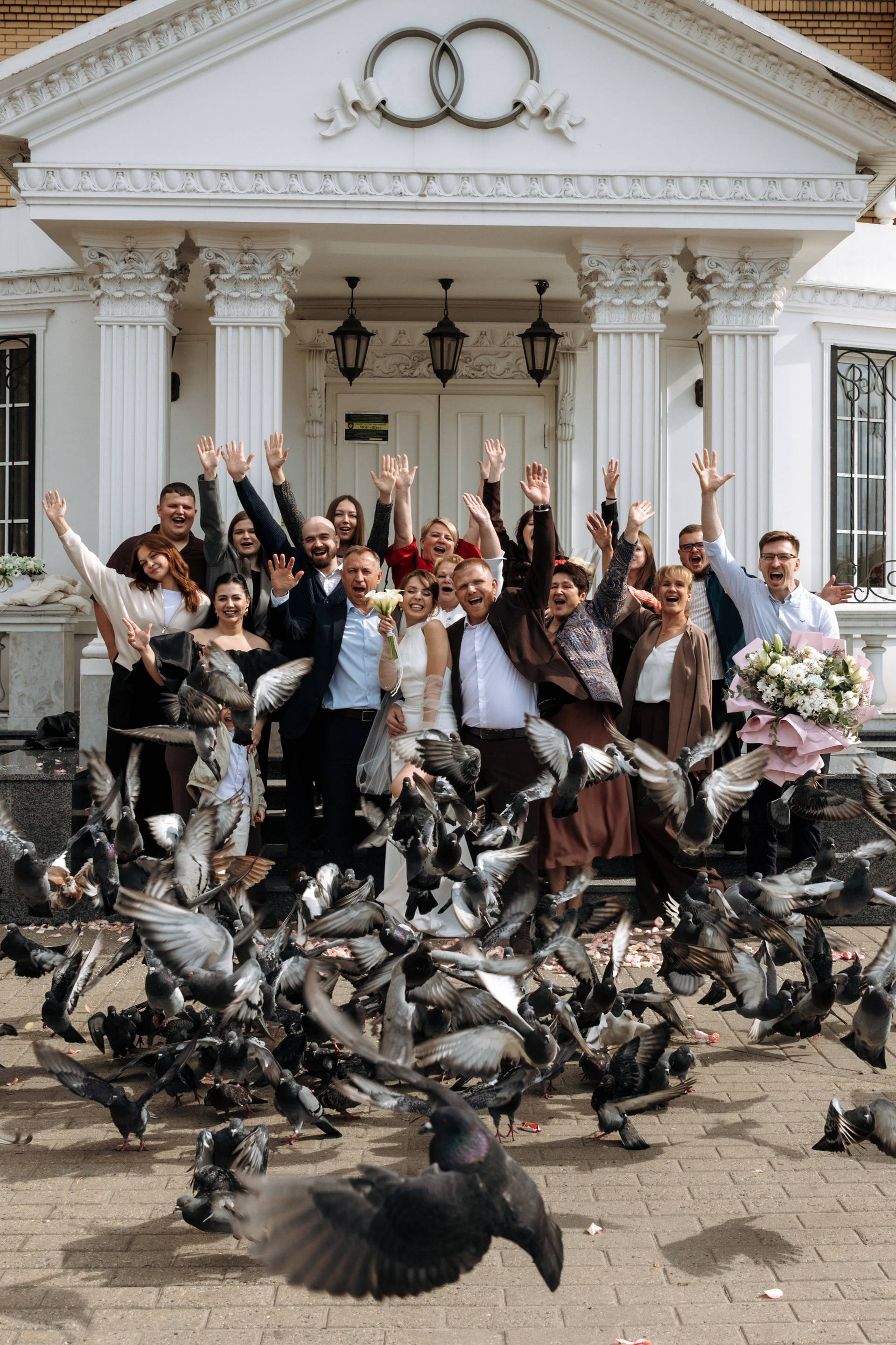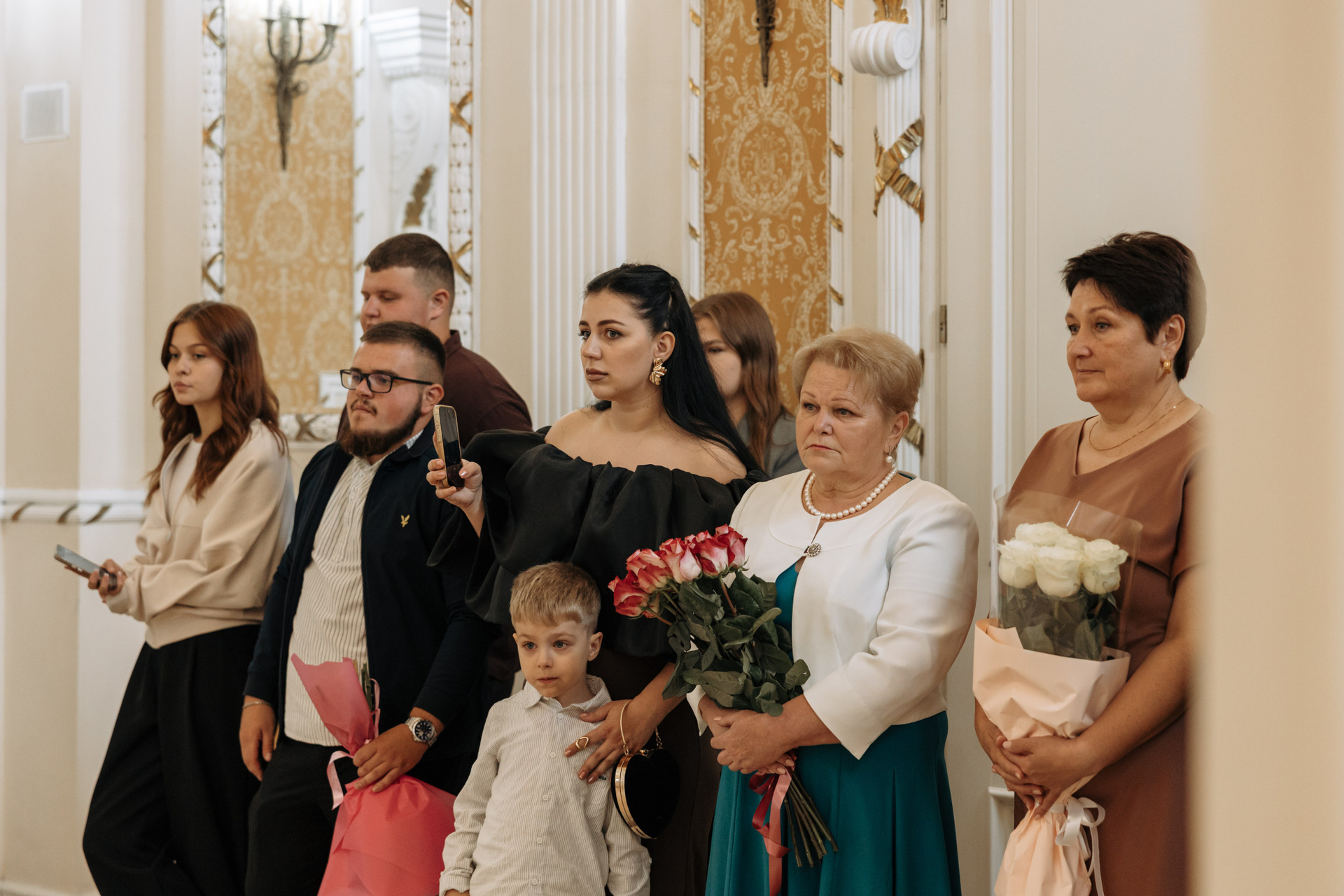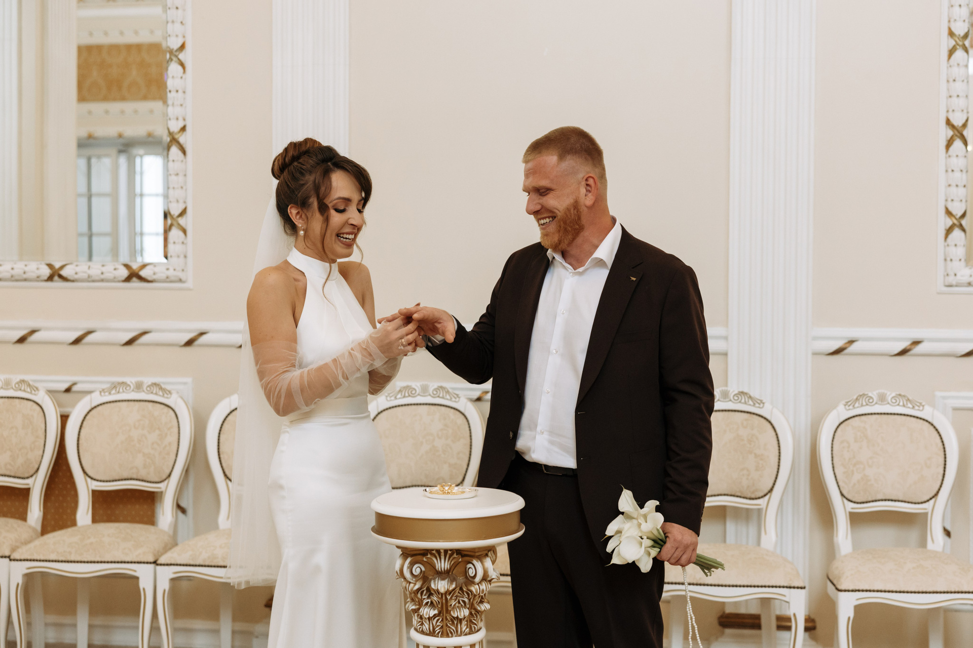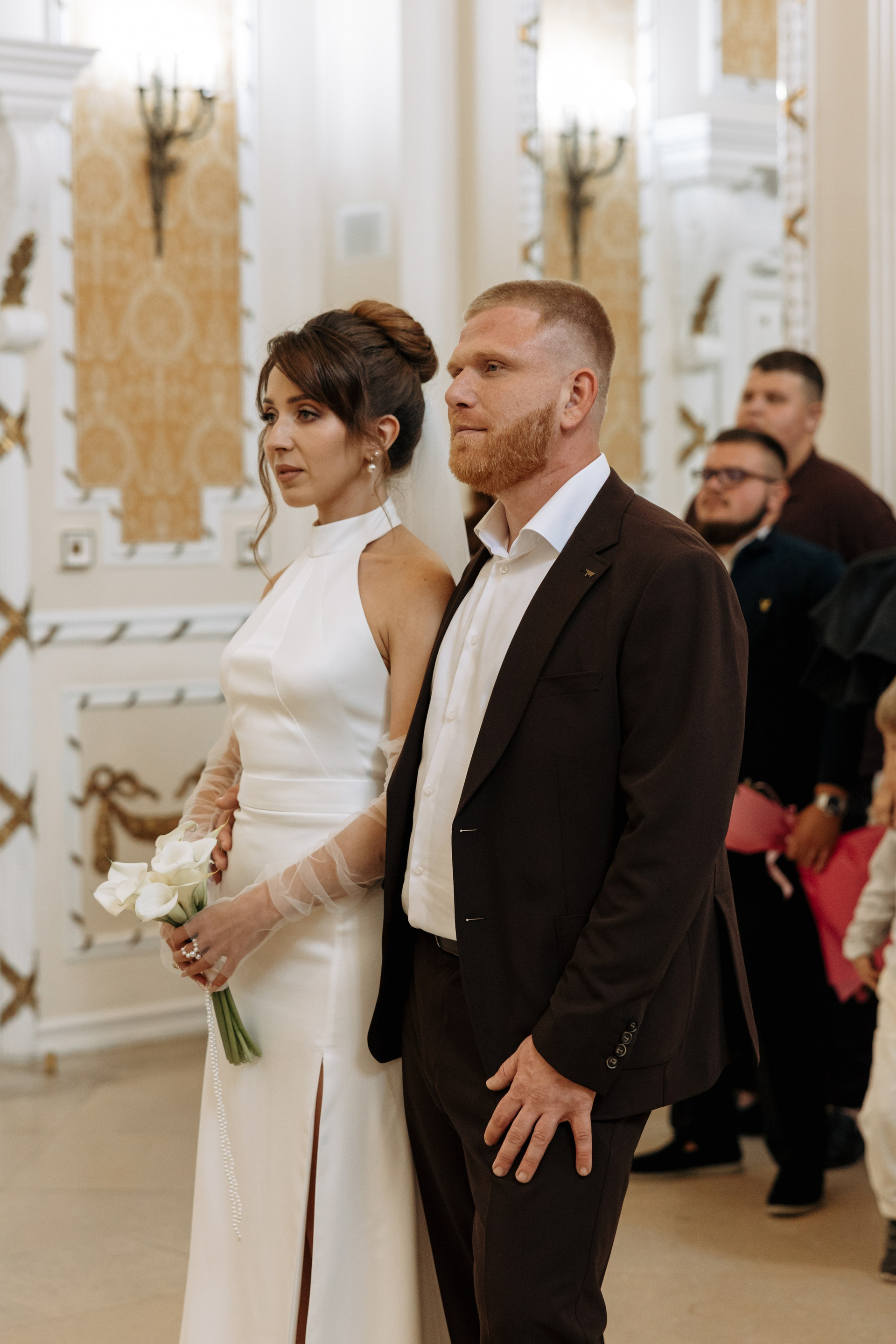 Затем сотрудники забирают пару на репетицию росписи, пока фотограф и близкие ожидают приглашения в зал